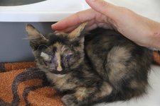 Während einer Kastrationsaktion im Osten von Kreta wurde uns letzten Sommer ein kleines Kätzchen vorgestellt. Sie war noch so klein, dass sie gerade mal eine Hand füllte. Ein Blick in ihre Katzenbox und es war klar, weshalb dies kleine Wesen unsere Patientin werden sollte: ihr rechtes Auge war ausgelaufen, das andere trüb, aber immerhin noch funktionsfähig. Was Katzenschnupfen alles anrichten kann sehen wir im Auslandstierschutz leider täglich.