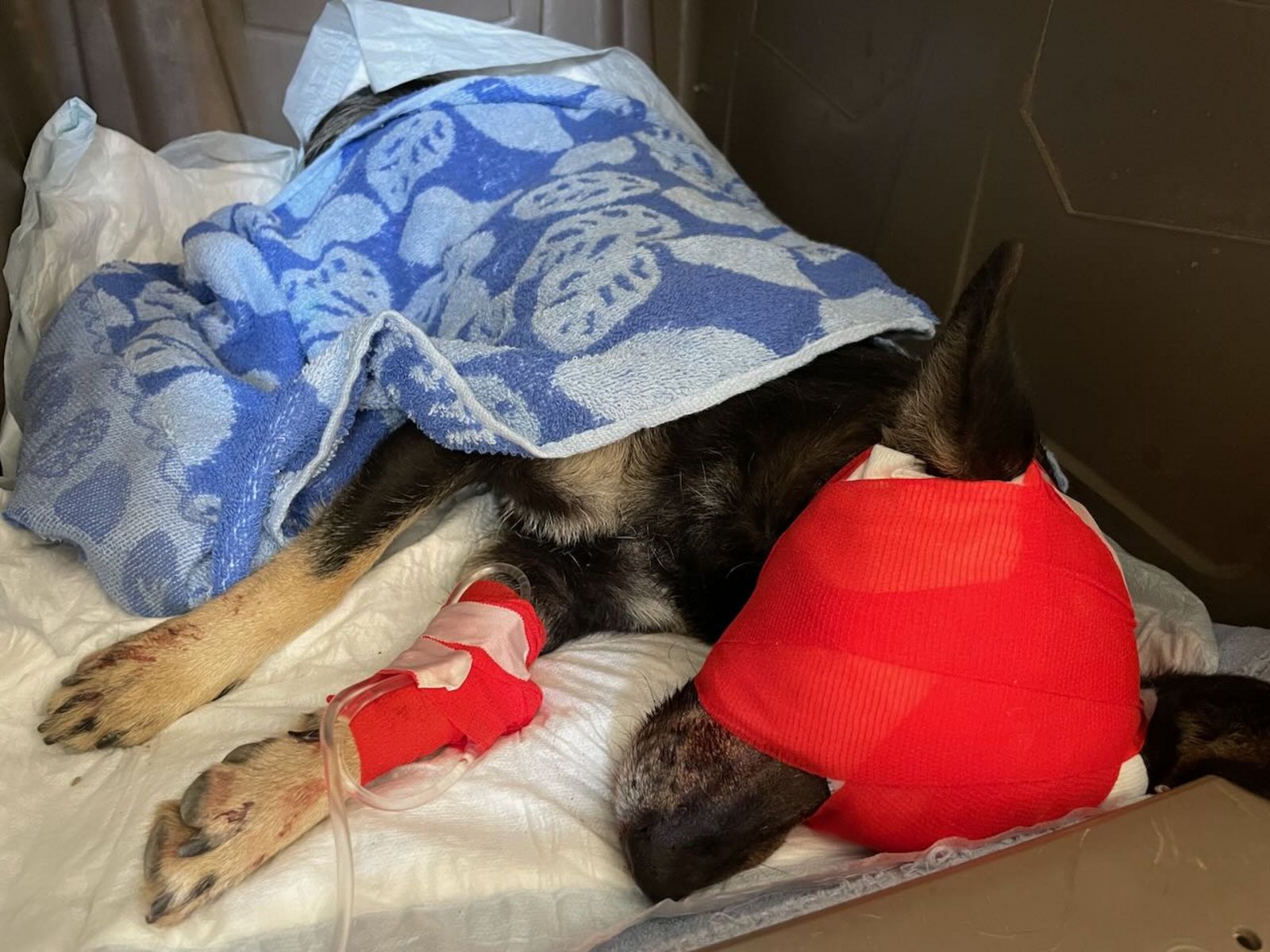 Wir geben der Injektion ein paar Minuten Zeit, um zu wirken. Als ich ein drittes Mal die Autotür öffne, schläft die Hündin tief und fest. In der Wolldecke eingewickelt trage ich sie in den OP. Alles ist bereits auf den Notfall vorbereitet. Als ich das Vorderbein für den Venenkatheter rasieren möchte, gerate ich ins Stocken. Die Stelle am Bein ist bereits rasiert. Mein Blick fällt auf den Bauch der Hündin, auch dieser ist kahl. Nina beantwortet meine unausgesprochene Frage, in dem sie das Hinterbein anhebt und ein frisch gestochenes „DF“ („Dein Freund“) Tattoo neben einer kleinen OP-Naht zum Vorschein kommt. Diese Hündin ist bereits bei uns gewesen. Sie war eine unserer Patientinnen und wurde vor ein paar Tagen kastriert. Wir beauftragen unsere rumänische Rezeptionistin, nachzuforschen wohin /zu wem dieser Hund gehört und fahren mit der Behandlung fort. Nachdem Nina das Gesicht von all dem Blut befreit hat, gelingt es ihr, eines der Augen zu reponieren, sprich es wieder zurück in die Augenhöhle zu drücken. Das Augenlid näht Nina zu, um den Augapfel daran zu hindern, wieder herauszufallen. In ein paar Tagen kann die Naht wieder gezogen werden. Dann wird sich zeigen, ob der Sehnerv geschädigt wurde oder das Auge tatsächlich noch „sehfähig“ ist. Das andere Auge wurde durch den Unfall leider komplett zerstört und muss chirurgisch entfernt werden. Da die Hündin keine weiteren Verletzungen am Körper trägt, wird das Auto bei dem Unfall wohl hauptsächlich ihren Kopf erwischt haben. Ich nenne unsere nun einäugige Patientin „kleine Piratin“ und leiste ihr beim Aufwachen Gesellschaft. Sie trägt einen roten Kopfverband, der sie daran hindert, ihren Kopf anzuheben, dafür reicht die Kraft noch nicht. Doch als ich sanft mit ihr spreche, beginnt sie langsam mit dem Schwanz zu wedeln. Von wegen gefährlich, von wegen bissig. Sie scheint mir wegen der Überwältigung mit der Wolldecke nicht böse zu sein, ganz im Gegenteil.