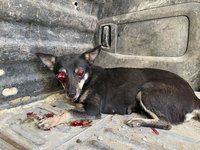 Kurze Zeit später kommen die Hundefänger wieder. Wir hören, wie das Auto über den Kies in die Einfahrt fährt. Ich husche hinaus, möchte als erste unsere neue Patientin anschauen. Vorsichtig öffne ich die Hintertür des Autos. Es ist stockdunkel in dem Wagen. Nur durch den Türspalt gelangt ein wenig Licht ins Innere. Gerade so viel, dass ich etwas erkennen kann. Ich sehe nicht nur einen, sondern gleich drei Hunde. Da waren die Hundefänger auf dem Hin- und Rückweg aber fleißig… In die Ecken gedrängt funkeln mich ängstliche Augen an. Die Hunde sind nicht in Käfigen untergebracht, sie liegen direkt auf der Ladefläche. Mit dem Fangstab um den Hals so platziert, dass sie sich kaum rühren können, zitternd vor Angst. Der eine Hund muss in einer sehr ungemütlichen Position ausharren, um sich nicht selbst zu strangulieren. Ich muss die Tür ein bisschen weiter öffnen, damit mehr Licht hineinkommt, um unsere Patientin, für die ich ja hinaus gegangen war, richtig zu sehen. Die schwarz/braune Hündin sitzt hechelnd in der hinteren, rechten Ecke. Ihr gesamter Kopf ist blutüberströmt, beide Augen sind aus den Augenhöhlen hervorgetreten. Das muss höllisch wehtun, denke ich mir, als plötzlich jemand die Autotür vor meiner Nase zuknallt. Vor Schreck mache ich einen Satz nach hinten. Einer der Hundefänger erklärt mir auf rumänisch und mit Händen und Füssen, dass ich vorsichtig sein muss, dass der Hund sehr gefährlich und bissig sei. So viel verstehe ich zumindest. Nun gut, stellt man sich einmal vor, man wird von einem Auto getroffen. Von jetzt auf gleich ist man komplett blind und orientierungslos. Man schmeckt den Geschmack von Blut im Mund, hört lautes Geschrei um einen herum und hat schreckliche Schmerzen. Dann versucht jemand eine Schlinge um den eigenen Hals zu werfen. Da soll bitte derjenige den ersten Stein werfen, der nicht panisch um sich schnappen würde.