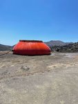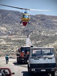 Wir quälen den Wagen zurück auf die Hauptstraße, an der die Feuerwehrmänner einen riesigen Pool aufgebaut haben. Tankwagen füllen ihn permanent mit Meerwasser. Über diesem Pool „steht“ der Hubschrauber, der eben noch auf der anderen Seite des Tals war, und lässt seinen Rüssel hinab. Er saugt das Löschwasser gierig auf wie ein Kolibri den Nektar einer roten Blüte.