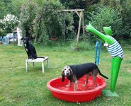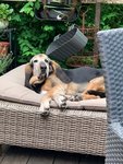 Ich glaube, er findet es durchaus akzeptabel, bei uns zu leben. Aber trotzdem hat er gewiss nicht die Absicht, nachsichtig mit uns zu sein, wenn wir gegen seine Regeln verstoßen. Und so kam es auch hier schnell zu kleinen und größeren Disputen; etwas nehmen zu wollen, was er für potenziell essbar hielt, bezahlten auch wir mit Blessuren. Aber ansonsten? Alles prima. Nathan ist nun dritter im Hundeseniorenmännerkreis, der an sonnigen Tagen hauptsächlich im kühlen Gras des großen Grundstücks schläft und nur gelegentlich in den Schatten wechselt - der aufmüpfige Nachwuchs wird nebenbei konsequent in die Schranken gewiesen. Und wenn er durchaus auch gerne mal eigene Wege geht, so ist er trotzdem immer zur Stelle, wenn wir etwas tun, um dieses Tun auch zu kontrollieren, denn seiner Meinung nach hatte er ja nun mal diese großartige Nase, um sie überall hineinzustecken. Und wenn er mit erstaunlicher Geschwindigkeit und wehenden Ohren gerannt kommt, dann lacht er über das ganze, ergraute Opi-Gesicht.