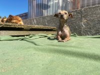 Bei jeder Kastrationsaktion gibt es mindestens ein Tier, das etwas in einem auslöst und welches einen ganz besonders berührt. In der diesjährigen Kastrationsaktion in Veria, Griechenland im Mai 2021 wurde uns eine kleine Fellnase gebracht, bei deren Anblick einem der Atem stockte. Die Hündin war sehr klein, hatte schlechtes Fell, lange Krallen und war deutlich unterernährt. Aus einem Auge lief Blut, beide Ohren waren verkrustet und an ihren Hinterläufen hatte sie zwei tiefe Wunden. Doch das Schlimmste war ihre Körpersprache. Der Schwanz war so weit eingezogen, dass man ihn nicht mehr sehen konnte. Sie krümmte sich vor Angst und versuchte sich in ihrer Box zu verkriechen. Aus den Augen erkannte man die reine Angst und Panik. Was hat dieses kleine unschuldige Wesen nur erlebt?