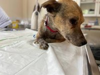 Sie ist in einem so schlechten Zustand, dass eine Kastration nicht möglich ist. Wir nehmen sie natürlich dennoch auf und überprüfen ihre Blutwerte. Zu ihrem schlechten Gesundheitszustand kommt auch noch die Diagnose Leishmaniose. Leishmaniose ist eine Infektionserkrankung, die durch den Stich einer Sandmücke übertragen werden kann. Unbehandelt kann eine solche Erkrankung für einen Hund lebensgefährlich werden. Uns ist sofort klar, dass diese Hündin nicht mehr auf die Straße zurück kann und wir setzen uns zum Ziel sie aufzupäppeln und transportfähig zu machen. Zu den täglichen Aufgaben gehört die lokale Behandlung des Auges mit Augentropfen als auch die Wunddesinfektion der Ohren. Zudem erfolgt auch die Behandlung der offenen Wunden an den Hinterläufen mit regelmäßigen Verbandswechseln. Natürlich wird sie nebenbei auch ordentlich von uns aufgepäppelt und mit Leckerlis verwöhnt.