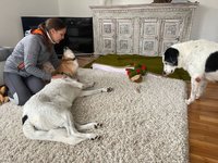 Jessica schickt eine Nachricht: „Evi ist total süß. Macht null Probleme, scheint stubenrein zu sein. Wir waren kurz draußen und brauchen noch ca. eine Stunde. Treffpunkt wie besprochen.“