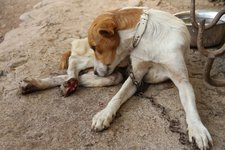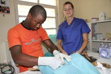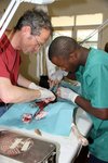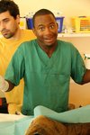 "Ein Hund liegt draußen mit einem übel zugerichteten Bein“", sagt Jenny mit einem traurig dreinblickenden Gesichtsausdruck.„ "Madueno, was würdest Du machen?“", fragt Ines, als das Tier vor ihr liegt, immer darauf bedacht, das Trainingsniveau hoch zu halten. Madueno tritt (da er mitten in einer OP ist) mit hoch erhobenen Händen (damit er nichts berührt, was unsteril ist) neben sie, wirft einen kurzen Blick auf das Bein, bittet Ines es zu beugen und zu strecken und sagt: „nicht amputieren.“ Ines jauchzt vor Glück, denn der oberflächliche Anblick hätte ebensogut die Diagnose „Amputation“ zugelassen. Aber alle Knochen und Sehnen sind intakt und selbst wenn das ein bisschen hervorschauende Gelenk offen ist, kann die kleine Hündin mit einem steifen Bein gut zurecht kommen. Madueno geht zurück zu seinem Platz und Ines versorgt gut gelaunt das Beinchen. Sie weiß, dass Madueno uns auch gerne gezeigt hätte, wie gut er amputieren kann, aber selbstverständlich steht die Erhaltung des Beines an erster Stelle.