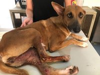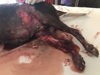 Der Tag neigt sich langsam dem Ende zu. Gilson steckt seinen Kopf in den OP: „Marga, kannst du dir kurz einen Hund angucken? Das Bein muss wohl amputiert werden, aber heute können wir das nicht mehr machen.“ Nebenan liegt eine große Hündin, die gerade einen Autounfall gehabt hat. Von einem Hinterbein ist nicht mehr viel übrig. „Kann sie auf dem anderen Hinterbein laufen?“, frage ich. Ja, das kann sie zum Glück. Ok, dann werden wir das Bein morgen amputieren. Gilson wäscht und säubert die Hündin so gut es geht, denn sie ist voller Sand und Dreck und an ihrer seitlichen Bauchwand klafft eine große Hautwunde, die wir heute nur provisorisch verschließen.