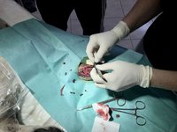 Also los, nützt ja nix. Einen Venenzugang konnten wir nur am Hinterbein legen. Vorsichtig leiteten wir die Narkose ein. Eine große Schüssel mit Wasser, viel Seife und mehrere Schwämme brachten langsam das Ausmaß der Verletzungen unter dem Dreck zum Vorschein. Auf dem OP-Tisch reinigte ich dann die Wunden in mühevoller Kleinstarbeit, das tote Gewebe auf der Oberfläche der Wunden und der restliche Dreck mussten entfernt werden. Die Haut zieht sich an dieser Stelle sehr schnell zurück und meine Befürchtung war, dass ich die Wunden gar nicht mehr zusammennähen kann. Beim zweiten Bein war es auch so, doch mit einigen chirurgischen Tricks konnte ich die Wundränder zumindest einander annähern.