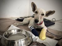 Susanna kannte den Hund von ihren Inseltouren, sie hatte immer Leckerlies für ihn dabei. Und sie wusste, dass wir an besagtem Tag mit unserer Klinik in Palmeira waren. Sie erklärte einem älteren Kapverdianer, der neben dem Hund saß, wo wir zu finden sind und dieser holte daraufhin sofort eine Schubkarre und brachte den Hund zu uns.