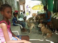 Pünktlich um neun Uhr fangen wir am Morgen zu arbeiten an. Wieder sind bereits viele Menschen mit ihren Hunden in unserem als Wartezimmer dienenden Vorhof versammelt, als wir eintreffen. Unser stets gefülltes „Wartezimmer“Dem kleinen Hund von gestern geht es erstaunlich gut, was mich natürlich ganz besonders freut. Nur der Besitzer, der am Vorabend sehr besorgt gewirkt hatte, wird sich in den nächsten Tagen nicht blicken lassen.Sehr irritiert durch dieses Verhalten werden wir uns gegen Ende unseres Aufenthaltes überlegen, einen neuen Besitzer für den rekonvaleszenten Hund zu suchen. Wie sich aber kurz vor meiner Abreise herausstellen wird, musste er sich unerwartet in Spitalsbehandlung begeben und konnte sich deshalb nicht melden. Heute führen wir wieder viele Operationen durch. Unter anderem muss dem Rüden mit dem offenen Bruch das Bein abgenommen werden. Den Knochen sägen wir - das hat schon Tradition, wie ich erfahre - in Ermangelung einer Knochensäge mit dem „Leatherman“ von Thomas durch. Am späten Abend zeigt sich der Hund, als wäre nie etwas gewesen! Nur Ines wirkt etwas müde. Dra. Fatyma ist von unserer Arbeit und den Methoden sehr beeindruckt. Vor allem die schnelle und mit einem minimalen Bauchschnitt durchführbare Kastrationsmethode für Hündinnen, mit der man ohne Assistenz operieren kann, die Ines anwendet und die ich mir in diesen Tagen aneigne, hat es ihr besonders angetan.Das Bestellsystem für die zu kastrierenden Hunde, das Gandi fest im Griff hat, funktioniert ausgezeichnet. Es sind immer genug, aber auch nicht zu viele Tiere zu unserer Verfügung. So operieren wir am laufenden Band und können uns am Abend über mehr als zwanzig erfolgreich durchgeführte Operationen freuen.Aber nicht nur Straßenhunde werden uns gebracht, eine seit einigen Jahren auf Santiago (das ist die Insel, auf der wir uns befinden) lebende Deutsche hat nur darauf gewartet, dass wir endlich wieder operieren, um von uns die Katzen kastrieren zu lassen, die sie in Pflege hat. Sie lädt uns auch in ihr Haus und an ihren Strand in der Nähe von Praia ein, aber dafür haben wir leider keine Zeit. Wir wollen die kostbaren Arbeitstage, die wir als gesamtes Team zur Verfügung haben, so gut wie möglich nützen.