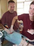 Wenn wir uns unserer Klinik nähern, werden wir von den Menschen auf der Straße freundlich begrüßt.Vor dem Haus warten dann bereits mehrere zur Operation angemeldete Hunde mit ihren Besitzern.Zuerst behandeln wir unsere eingestellten Tiere. Wir haben immer mehrere kranke Tiere da. Im Laufe der Zeit werden wir - teils nacheinander, teils gleichzeitig - folgende Tiere stationär bei uns behandeln: ;- den kleinen schwarzen Hund mit den Beinverletzungen;- die kleine Hündin „Dita“ mit einer alten offenen Fraktur. Aus der Wunde rinnt übel riechendes Sekret, und das Bein ist sehr schmerzhaft. Aber die Behandlung hilft, und nach der Entfernung zweier Knochensequester (abgestorbene Knochenbruchstücke) kann das Bein abheilen. Ines entfernt die Knochenstücke- zwei hochgradig an „Sarna“, der Räude erkrankte Hunde, die kein Fell und kaum noch Haut auf ihren klapperdürren, wunden Körpern haben.- die schöne Hündin „Fofa“, die bereits vor einem Jahr von uns kastriert wurde, aber trotzdem ein Stickersarkom (durch Geschlechtsverkehr übertragener, ansteckender Genitaltumor) entwickelt hat.- zwei Welpen mit parvoähnlichem Durchfall und Erbrechen (die Parvovirose ist eine auch als „Katzenseuche“ bekannte sehr aggressive, blutige Entzündung des Magens und des Darmes);- ein Welpe mit Pneumonie und hochgradiger Anämie (Blutarmut); Um ihn zu retten, erhält er eine Bluttransfusion. Als Blutspender muss ein gesunder und kräftiger Hund, der schon länger in unserem Haus lebt, herhalten.- die schöne elfenbeinfarbene Hündin „Nala“, deren deformierte Pfote von einer Serienfraktur der Metacarpi (Mittelhandknochen) herrühren dürfte.Bis auf die Welpen mit der hämorrhagischen Gastroenteritis (blutigen Magen - Darmentzündung) überleben alle.Nach einer kurzen Besprechung starten wir die Operationen und operieren ohne Pause bis zum Mittagessen. Anfangs operieren vor allem Ines und ich, doch bald lassen wir auch Fatyma, Cesaltina und die beiden Portugiesinnen Ana und Inês ihre ersten Tiere unter Anleitung kastrieren.Zu Mittag gibt es jeden Tag eine andere kapverdische Köstlichkeit, die von unserer Vermieterin, Dona Maria Olivia, zubereitet wird. Deutsch - Österreichische Zusammenarbeit Ein schönes Gefühl, sich auf den anderen verlassen zu können!Nach einer kurzen Pause operieren wir bis zum Einbruch der Dunkelheit, und wenn wir durch aufwändige Behandlungen oder Notfälle aufgehalten werden auch länger. Madueno darf auch einmal nähen und ist stolz wie Oskar. Er ist 15 Jahre alt.