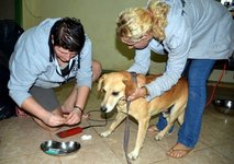 Neben den Straßenhunden spielen auch die Privathunde eine große Rolle in der Vermehrung der Population, da die meisten Privathunde frei auf der Straße herumlaufen. Leider sind viele der Menschen immer noch der Meinung, dass es den Hündinnen gut tut, mindestens einmal Welpen zu bekommen, was aus medizinischer Sicht übrigens totaler Blödsinn ist. Wenn die Welpen jedoch größer werden und nicht mehr so süß sind, werden sie einfach auf die Straße gesetzt. Bei vielen Hundebesitzern mussten wir all unsere Überredungskunst (und Bestechung z.B. mit Halsbändern) anwenden, um sie zu überzeugen, ihre Hunde kastrieren zu lassen, aber der Großteil der Bevölkerung hat die Aktion sehr gut angenommen. Vor unserer Tür hatte das Militär ein großes Zelt aufgebaut, in dem die Hunde und ihre Besitzer warten konnten, bis sie an der Reihe waren. Diese Hilfe zeigt uns, dass wir auf Sal von Seiten der Bürokratie willkommen sind! Hier fanden auch die Behandlungen der Tiere gegen Würmer, Zecken und Flöhe statt. Jedem, der sein Tier bei einer der vorangegangenen Aktionen hat kastrieren lassen, steht dieser "Service" kostenlos zur Verfügung, was tatsächlich auch genutzt wurde. Und wie!!!