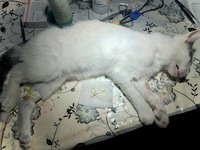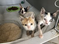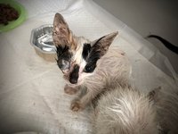 An Tag zwei wurden uns drei winzige Katzenwelpen gebracht, sie waren in einem jämmerlichen Zustand. Viel zu dünn, struppiges Fell, verwurmt und verfloht und bei einer war das Auge so geschädigt, dass es entfernt werden musste. In diesem Zustand konnte ich jedoch bei keiner der Babys eine OP wagen, sie waren so nicht narkosefähig. Sie blieben bei uns in einer großen Hundebox und wurden behandelt und gepäppelt. Nach ein paar Tagen bekamen sie von Birthe (OSPA) noch ein Bad und sahen danach wie neu geboren aus. Unter normalen Umständen würde ich bei so einer kleinen Kreatur das Auge nicht entfernen-doch ich weiß, wenn ich es jetzt nicht mache, dann macht es keiner hier-und das kann zu schweren Entzündungen und aufsteigenden Infektionen des Sehnervs führen. Nach der OP war die Kleine entsprechend geschwächt und mir kam der Gedanke, dass ich vielleicht doch die falsche Entscheidung getroffen hatte. War es zu viel? Würde sie es nicht überleben? Wir nahmen sie mit nach Hause, schön warm eingemummelt in Tüchern und mit Wärmflasche. Ein bisschen Infusion, ein bisschen Soße vom Nassfutter mit der Spritze ins Mäulchen. So schwach war sie. Nur zögernd ging ich ins Bett, stellte mir alle zwei Stunden den Wecker und hatte keine Ahnung, ob sie am nächsten Morgen noch am Leben sein würde. Doch sie zeigte mir, dass sie eine Kapverdianerin ist. Sie kämpfte sich durch, egal wie widrig die Umstände waren. Sie hätten sie sehen sollen, als ich ihr am nächsten Morgen das Nassfutter vor die Nase stellte. Ich habe ein Video, das lässt sich hier leider nicht abdrucken. Gierig verschlang sie alles, was ich ihr vorsetzte und dabei machte sie knurrende und grunzende Geräusche. Ein paar Tage später ging sie mit ihren zwei Brüdern zurück zur ihrer „Finderin“, die sich bereit erklärt hatte, die drei in ihre Obhut zu nehmen.