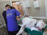 Freitag gegen 10.00 Uhr bin ich angekommen, da waren die ersten Hunde bereits kastriert, einer lag auf dem Tisch, einer schlafend am Boden, einer wurde vorbereitet und fünf warteten darauf, unter die liebevollen Hände bzw. Messer der beiden Ärztinnen Melanie und Dörte zu kommen. Dörte Krause ist eine junge Ärztin, relativ neu im Team und bereits voll integriert. Sie bereitet beruhigend die Tiere vor, rasiert die OP-Stelle, verabreicht die Beruhigungsspritze, ist Assistenz bei der Narkose und macht die Aufwachroutine.