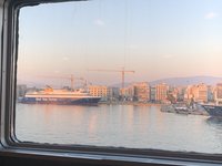 Das tut sie auch, aber leider nur bis 13:35 Uhr. Das was wir sehen, als wir am Hafen sind, ist die Laderampe, die gerade eingeklappt wird und LKW Fahrer, die kurz davor sind, einen Mord zu begehen. Es nützt nichts, die Fähre ist weg, aber wir erfahren, dass um 16:30 eine weitere nach Patras ablegt. Nun versucht der Professor mich erneut in die Endlosschleife einzureihen, was ihm aber nicht gelingt. Ich habe Schaum vor dem Mund (was wer wegen des Mundschutzes aber nicht sehen kann), fluche auf Deutsch und ich bin mir sicher, dass er jedes einzelne Wort versteht. Auf jeden Fall darf ich direkt zum Schalter und kann auch ohne Probleme umbuchen.