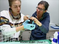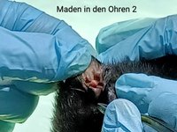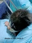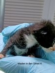 Unterwegs zum NLR tauschen wir Katzen und werfen die Müllsäcke in die nächste noch aufnahmefähige Tonne an der Strasse. Im NLR warten schon unsere Pfleglinge auf Futter, Behandlung und Streicheleinheiten. Zu dritt ist das bald erledigt und wir freuen uns auf eine warme Dusche und ein schnell gekochtes, gemeinsames Abendessen. Eine langjährige Helferin bringt am Abend noch zwei Katzenbabys, die sie neben der toten Mutter gefunden hat. Aus den Ohren der beiden holt Marga eine Unmenge an Fliegenmaden! Sie haben sich schon so weit hineingefressen, dass die Babys nicht mehr zu retten waren.