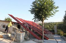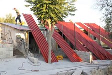 Es war uns vom ersten Moment an klar, dass alles an diesem Stall krumm und schief ist. Hinzu kommt der Betonboden, den wir mit einem entsprechenden Gefälle gegossen haben. Nun, wo die Trennmauern stehen, fällt das Schiefe extrem auf. Aber stört das irgendjemanden? Die Hunde bestimmt nicht, und da alles schief ist, hat dies sogar Charme. Wir werden die Trenngitter entsprechend schweißen und damit die optische Achse wieder finden. Oder auch nicht... Das Zweite ist die Randabdeckung des Daches. Es gibt keine vorgefertigten Bleche, die verhindern, dass Ungeziefer sich in unserer Isolierung ausbreitet. Wir werden selber irgend etwas anfertigen müssen.