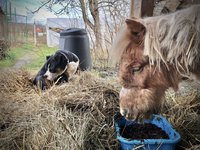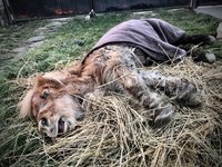 Doch unser Kampf ist verzweifelt. Bis ich eines feststelle: Es sind wir, die verzweifelt kämpfen. Nicht Du. Du wirkst zufrieden. Ich denke, Du hattest nie in Deinem Leben so weich in frischem Stroh gelegen, nie so gutes Heu zu fressen bekommen, nie war stets frisches Wasser zur Verfügung. Immer waren freundliche Menschen um dich, die mit dir sprachen, die Dich kraulten. Du hast es offensichtlich genossen, in Gesellschaft zu sein und unsere Hunde waren ganz besonders tolle Krankenpfleger. Besonders Pflegehündin Rika wich Tag und Nacht nicht von Deiner Seite, schlief neben Deinem Kopf. Selbst als Deine Kräfte Dich verließen, war das noch immer so friedvoll, so würdevoll, so natürlich. Kein Kampf, kein Hadern.