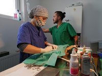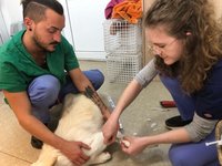 Im Tierheim angekommen beginnen wir sofort mit der Arbeit. Die Arbeitsabläufe sind dieselben wie in Griechenland, so komme ich schnell wieder in eine Routine. Im Vorfeld hatte ich mir Sorgen gemacht, dass ich erst einmal alles aufhalten werde. Immerhin ist es nun über ein Jahr her, dass ich zuletzt einen Venenkatheter geschoben habe. Als hätte mein Körper die Handgriffe fest gespeichert, funktioniert aber alles auf Anhieb. Wie ein Fisch, der ins Wasser gehalten wird und sofort beginnt zu schwimmen. Ich tauche ab, genieße die Arbeit, freue mich nach so langer Zeit wieder praktisch zu arbeiten, zu helfen und zu wissen, dass das Leben unserer Patienten durch unsere Arbeit ein kleines bisschen besser werden wird. Dennoch bin ich froh, dass Gabriel (unser neuer Assistent) an meiner Seite ist. So habe ich auch hin und wieder Zeit, um Nina beim Operieren zu beobachten, jeden Handgriff zu speichern, sie mit Fragen zu bombardieren (Sorry Nina dafür ;-) ) und das ein oder andere Gelernte aus der Uni anzuwenden. Nur Redoxgleichungen sehe ich hier keine...
