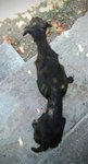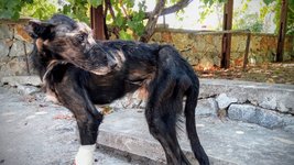 Das Team stand im Kreis und er, der Hund, in der Mitte. Rocky. Er lag in einer offenen Box im Auto und schaute uns an. Zwei rotbraune Augen mit einem eingefrorenen Blick. Ihn dünn zu nennen, wäre ein Kompliment: sein Körper bestand nur aus schwarzer Haut und Knochen. Übersät mit Wunden, Schuppen, dazu hing ein Seil um seinen Hals.