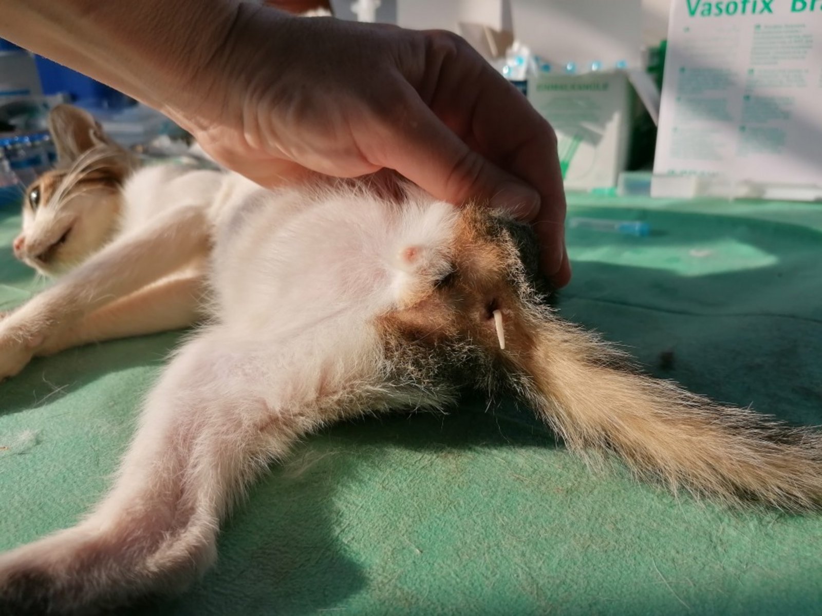 Neben der Kastration bekommen die Katzen bei uns auch das volle Programm an Parasitenbehandlungen. Dass dies auch dringend notwendig ist, sehen wir hier sehr deutlich. In diesem Fall ist es ein Bandwurm, aber auch Spulwurmer, Flöhe und Zecken begegnen uns fast täglich.