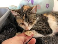 Dich in dem Zustand zum Tierarzt zu bringen, um ein Röntgenbild anfertigen zu lassen, habe ich mich nicht getraut. Daher haben wir abgewartet, dir viel Ruhe gelassen, dich warmgehalten. Jede freie Minute verbrachte ich neben deiner Box, bot dir alle möglichen Futtersorten an, die wir vorrätig hatten, in der Hoffnung, du würdest irgendetwas davon probieren. Wenn ich dein kleines Köpfchen streichelte, fingst du an zu schnurren. Dieses Gefühl, wenn eine zunächst „wilde“ Katze plötzlich merkt, wie schön es ist, gestreichelt zu werden und anfängt zu schnurren – das ist unbeschreiblich.