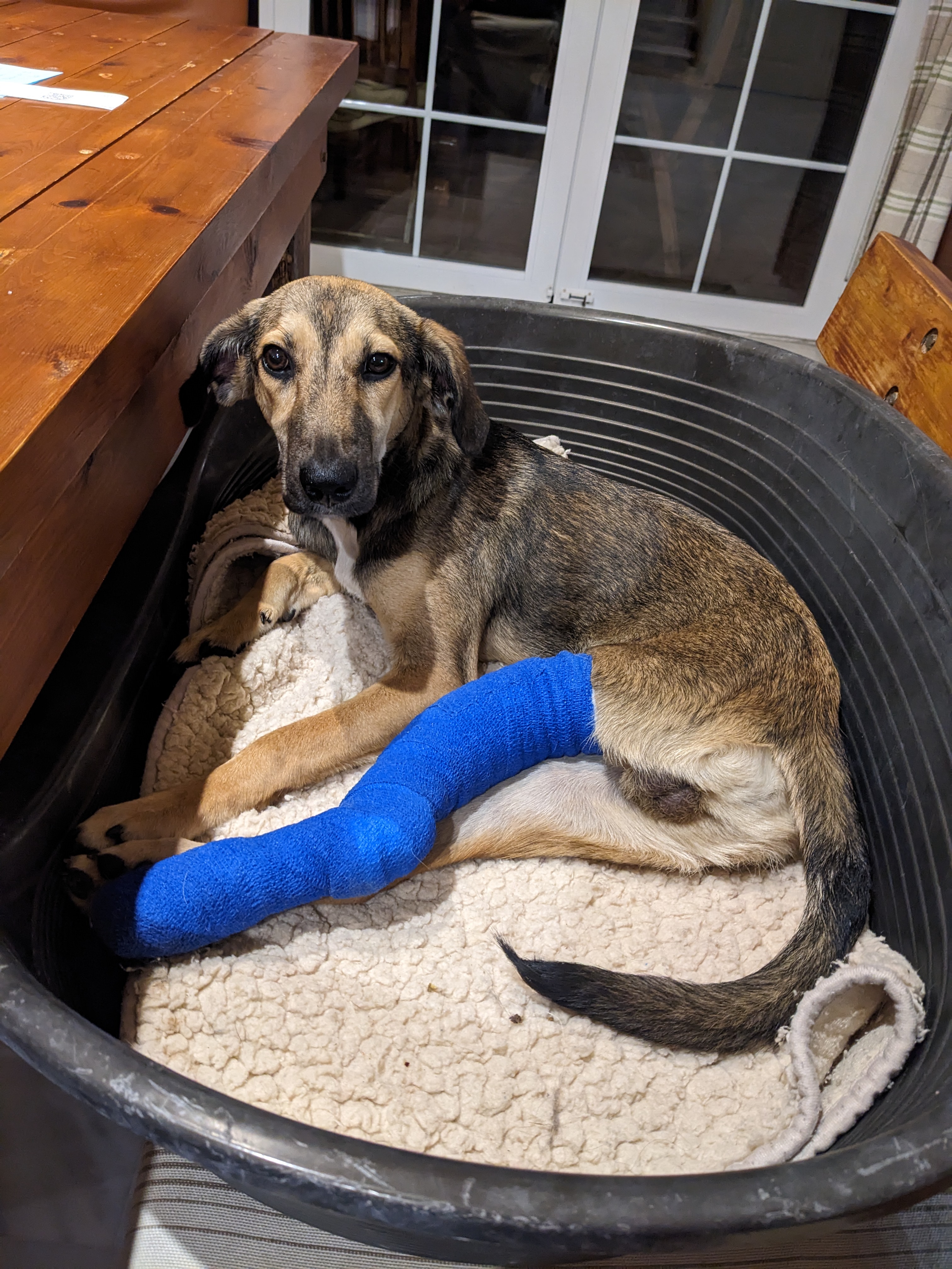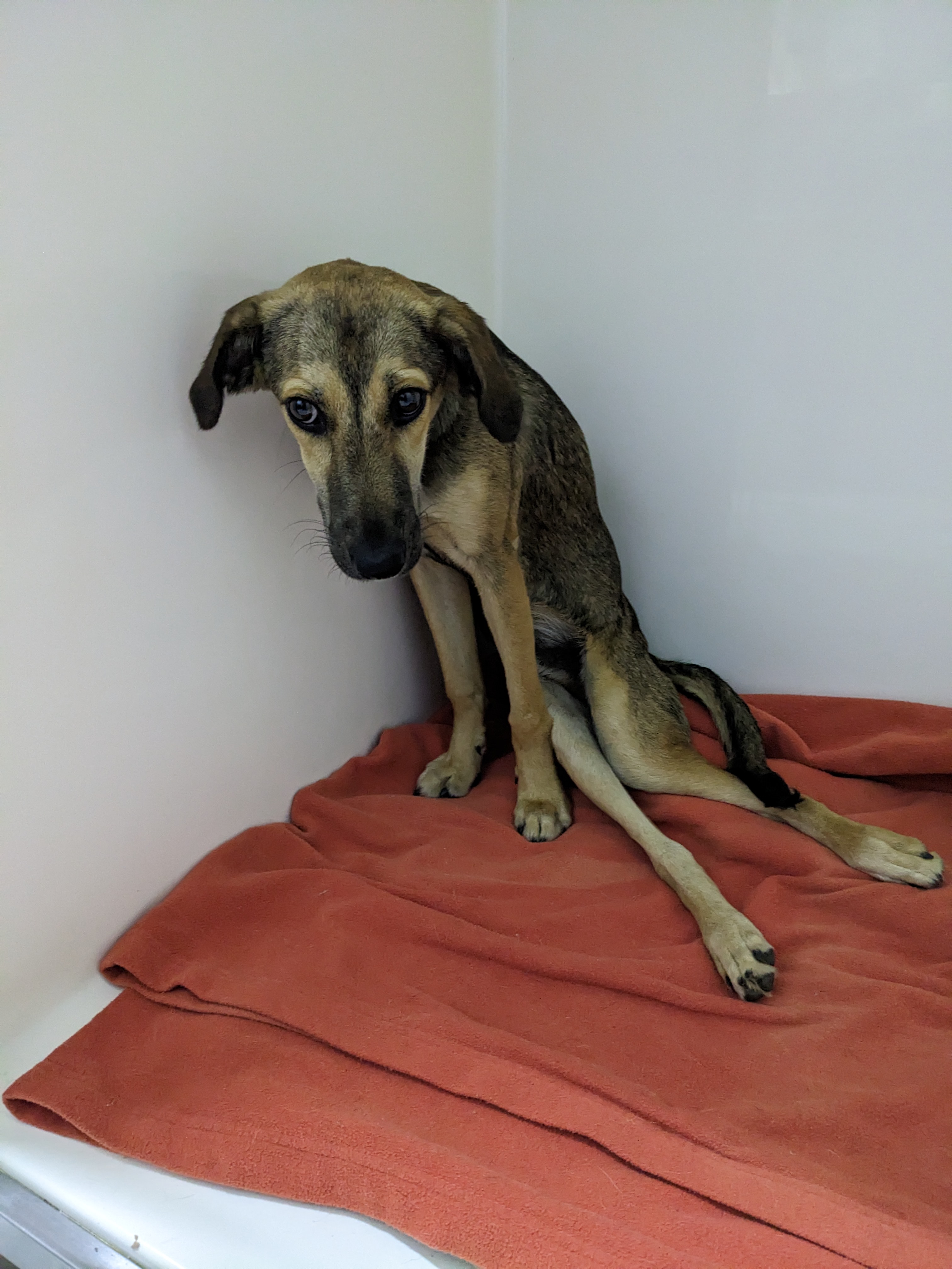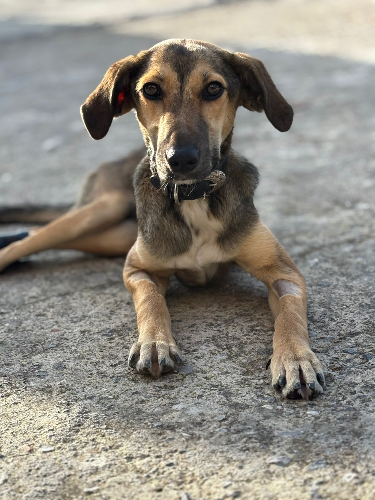 Juno wurde als etwa 7-monatiger Welpe in einem Tierheim auf Kreta abgegeben, in dem wir gerade im Einsatz waren. Zu der Zeit hatte er zwei gelähmte Hintergliedmaßen durch eine Rückenmarksverletzung und einen Knochenbruch am linken Schienbein. Er muss kurz zuvor einen schweren Unfall gehabt haben und hatte zumindest einen kleinen Schutzengel, der ihn uns kurz vor unserer Abfahrt in die Arme leitete.