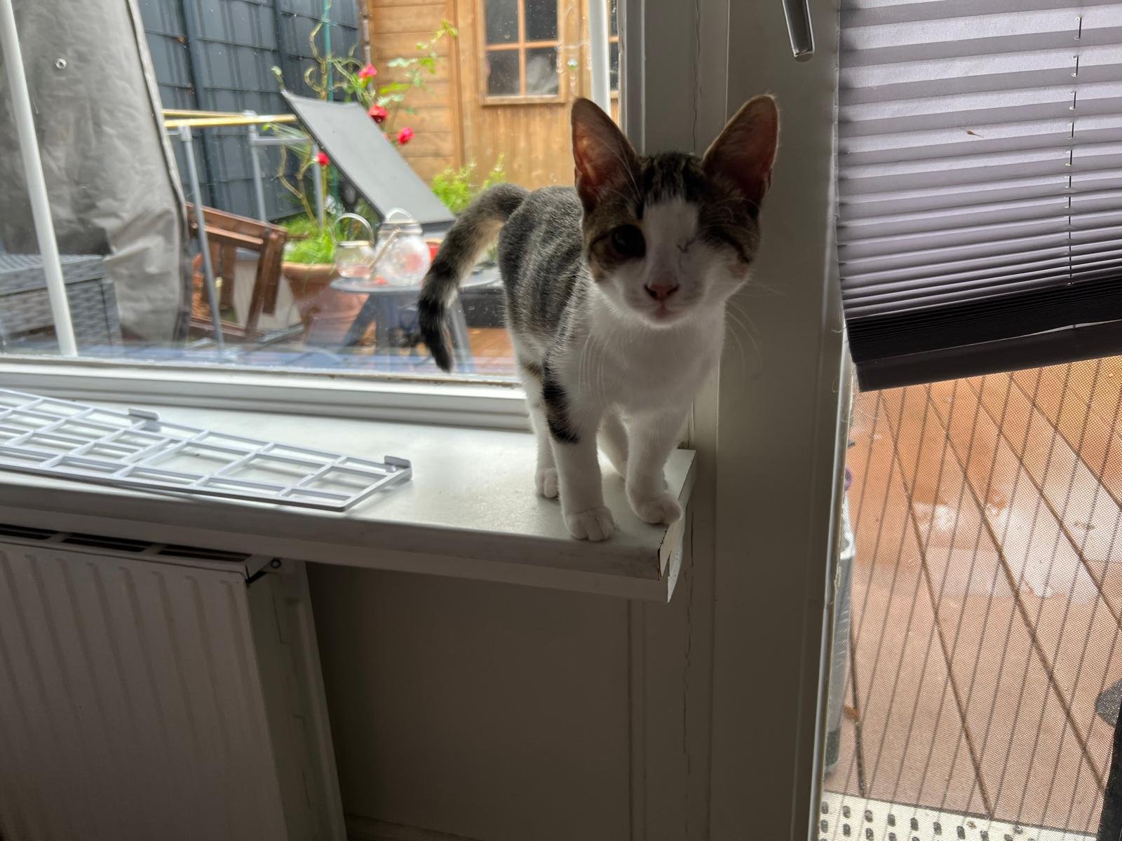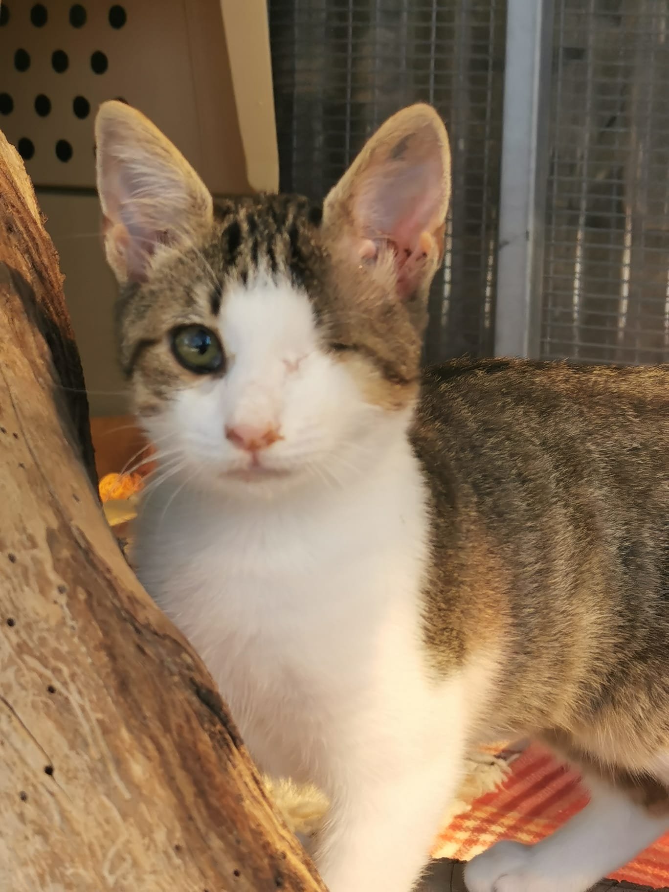 Die zwei zuckersüßen, Anfang Mai geborenen Katzenkinder haben leider einen schweren Start gehabt. Über eine Tierschützerin wurden sie zu einer unserer Kampagnen auf Kreta gebracht. Zwei ganz kleine Wesen, die total verschnupft, mit schlimm verklebten Augen, voller Flöhe und abgemagert waren. Irgendwo ausgesetzt wurden sie einfach sich selbst überlassen, sodass das 3. Geschwisterchen im Bunde es leider nicht schaffte. Unsere Kollegen kümmerten sich voller Hingabe um sie, behandelten sie und zogen sie mit der Flasche groß. Leider konnte jeweils ein Auge bei beiden nicht gerettet werden, da die Beschädigungen durch den Katzenschnupfen einfach zu gravierend waren. Jedoch kommen sie mit ihrem einen Auge ganz hervorragend zurecht. Man sollte damit rechnen, dass sie vielleicht ab und an mal ein paar Augentropfen brauchen, da auch die verbliebenen Augen einfach heftig dem Katzenschnupfen ausgesetzt waren. Das ist aber nicht schlimm und machen sie prima mit - wenn es dann mal nötig sein sollte. Gesundheitlich sind sie nun ganz fit.