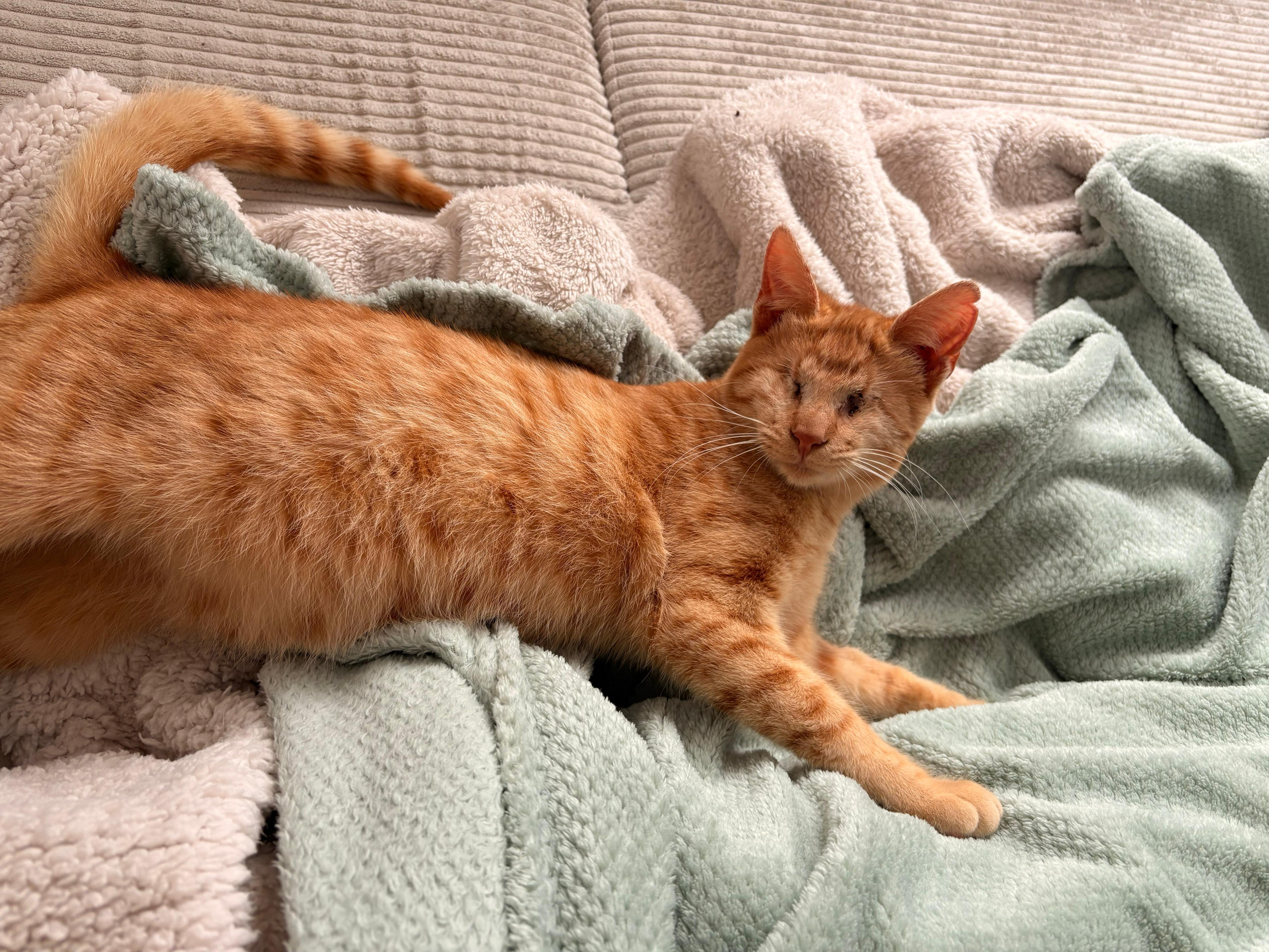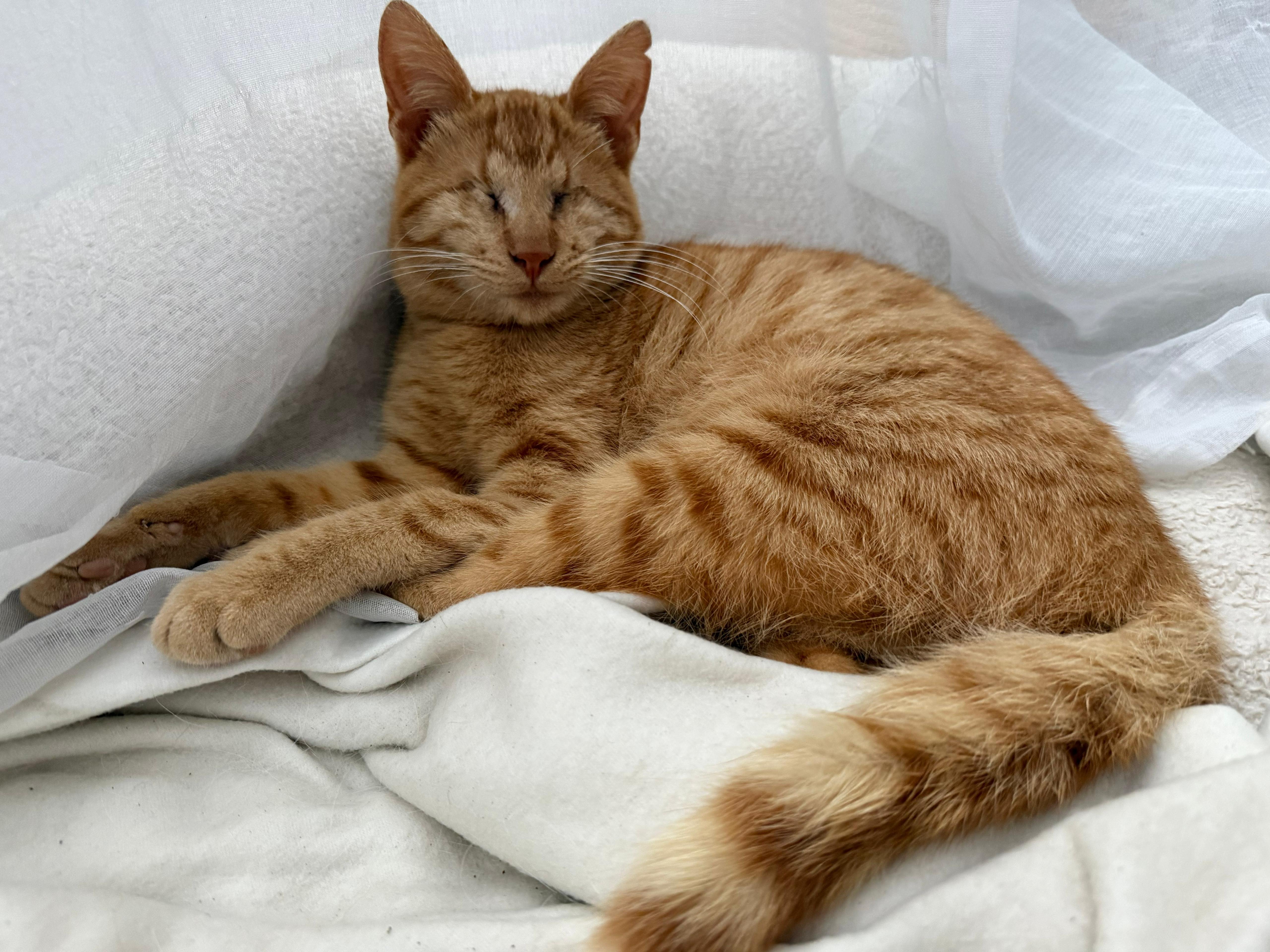 Samson hat ein typisches Schicksal eines armen kleinen Straßenkätzchen erlitten. Krank und einsam wurde er von einer fleißigen Fängerin auf der Straße gefunden und zur Kastration zu uns gebracht. Leider hatte er zu diesem Zeitpunkt schon so schlimme Augen, dass sie beide nicht mehr zu retten waren und entfernt werden mussten. Ein solches Kätzchen setzt man natürlich nicht zurück auf die Straße, so blieb das kleine süße blinde Kerlchen bei uns und wir versprachen ihm ein gutes Zuhause für ihn zu finden, an welchem es ihm sein Leben lang an nichts fehlen soll.